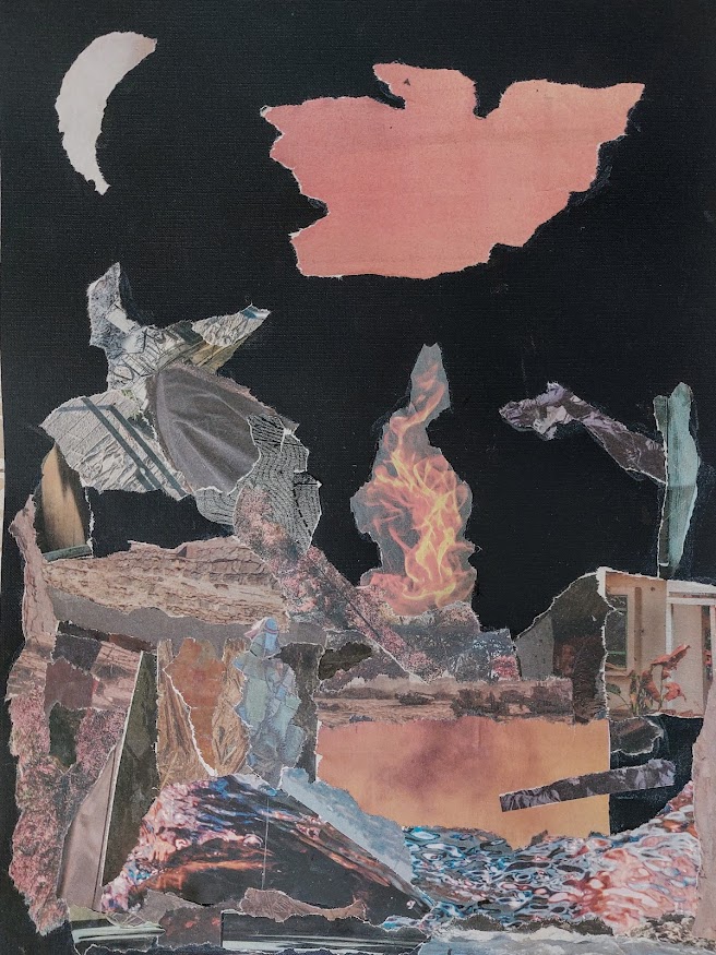 Esther Lixenberg Bloch, Phoenix, collage on black canvas paper, 30.5 X 40.5, 2024